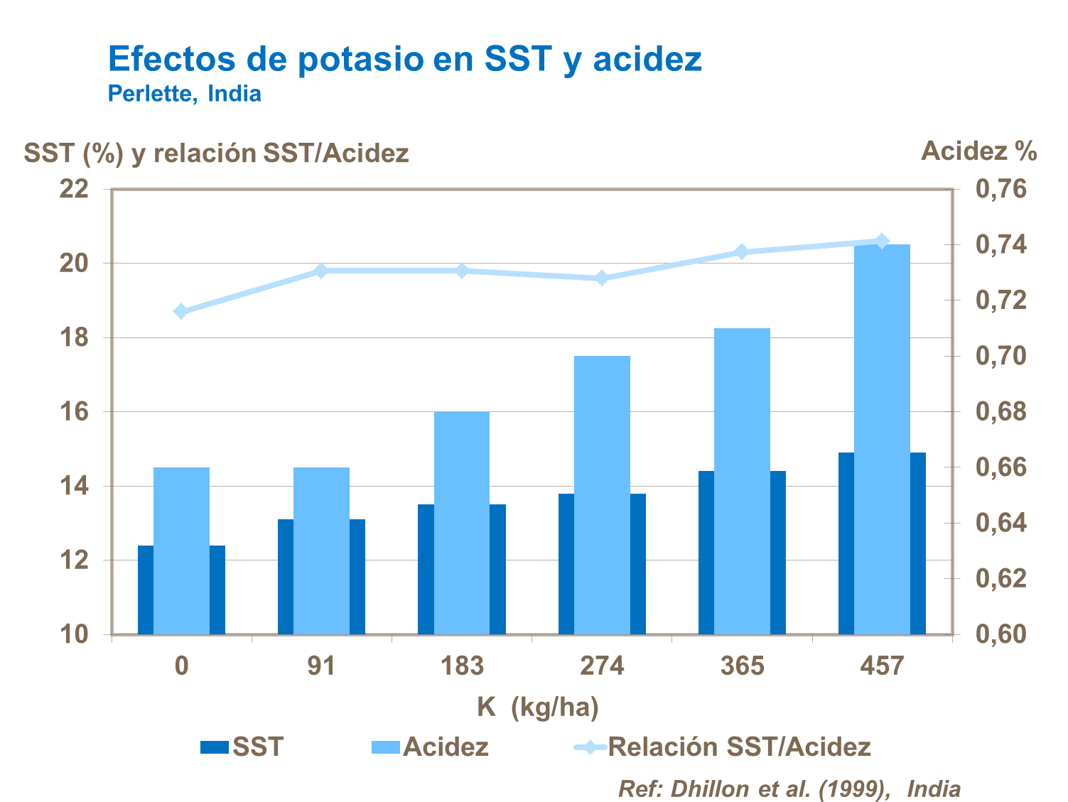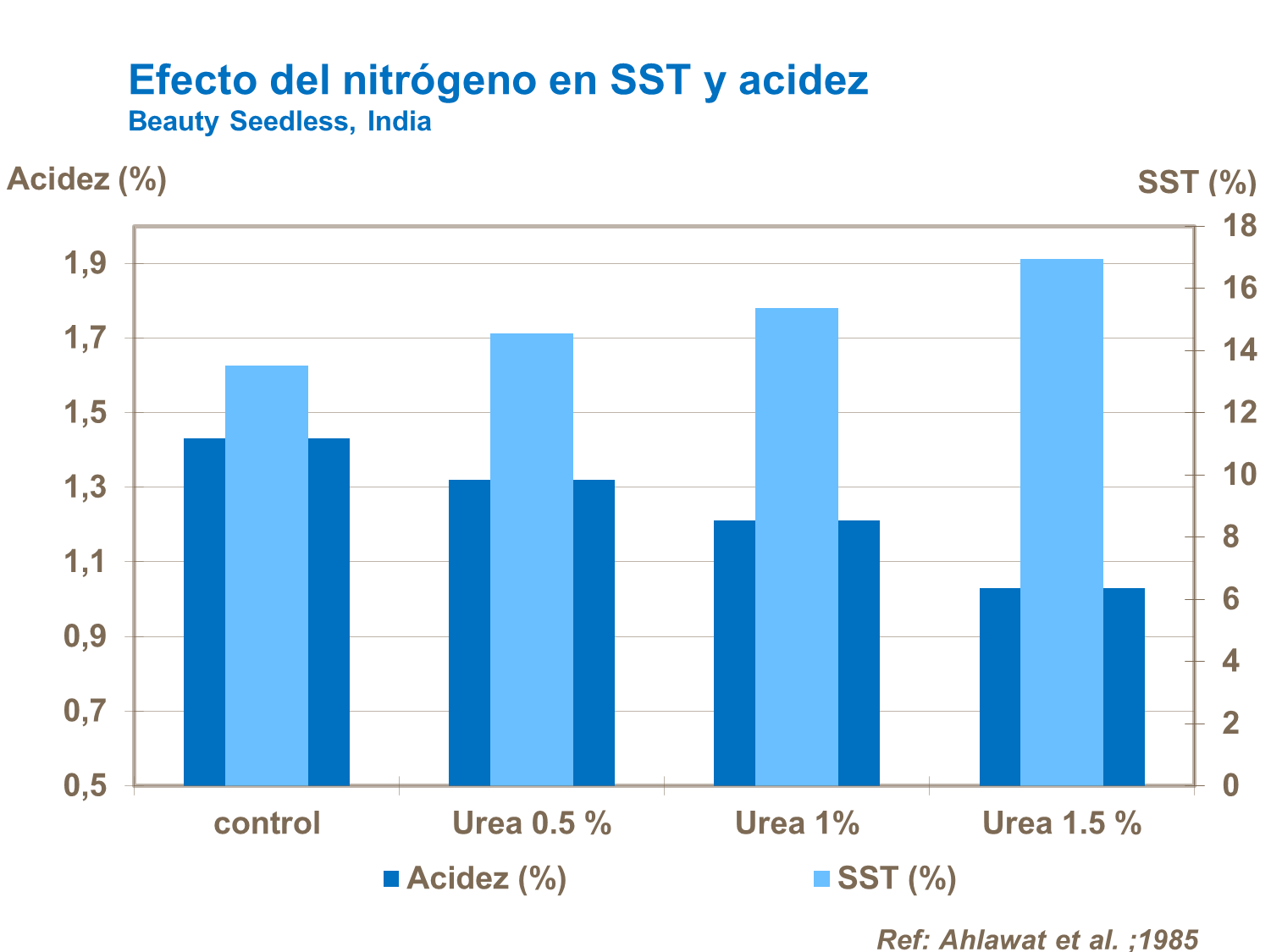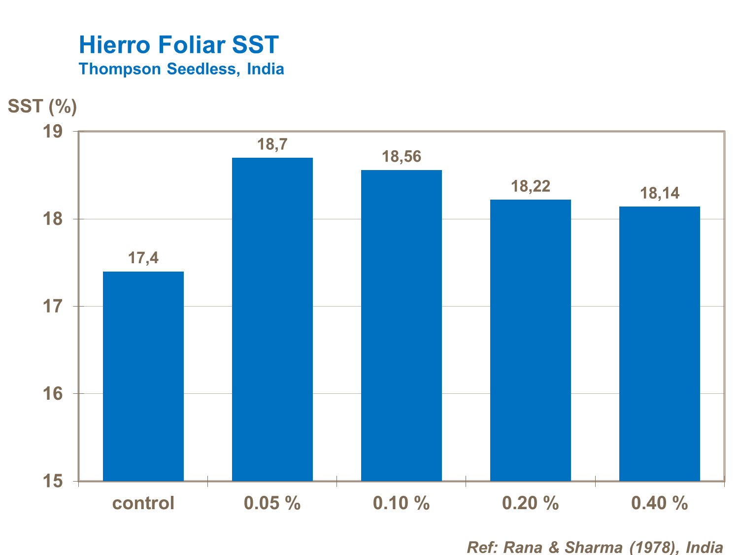 Niveles óptimos de hierro aumentaron el contenido de SST en uvas de acuerdo con ensayos realizados en India. El hierro es particularmente necesario para la producción foliar temprana y la fotosíntesis, para asegurar un mejor desarrollo y calidad de las uvas.