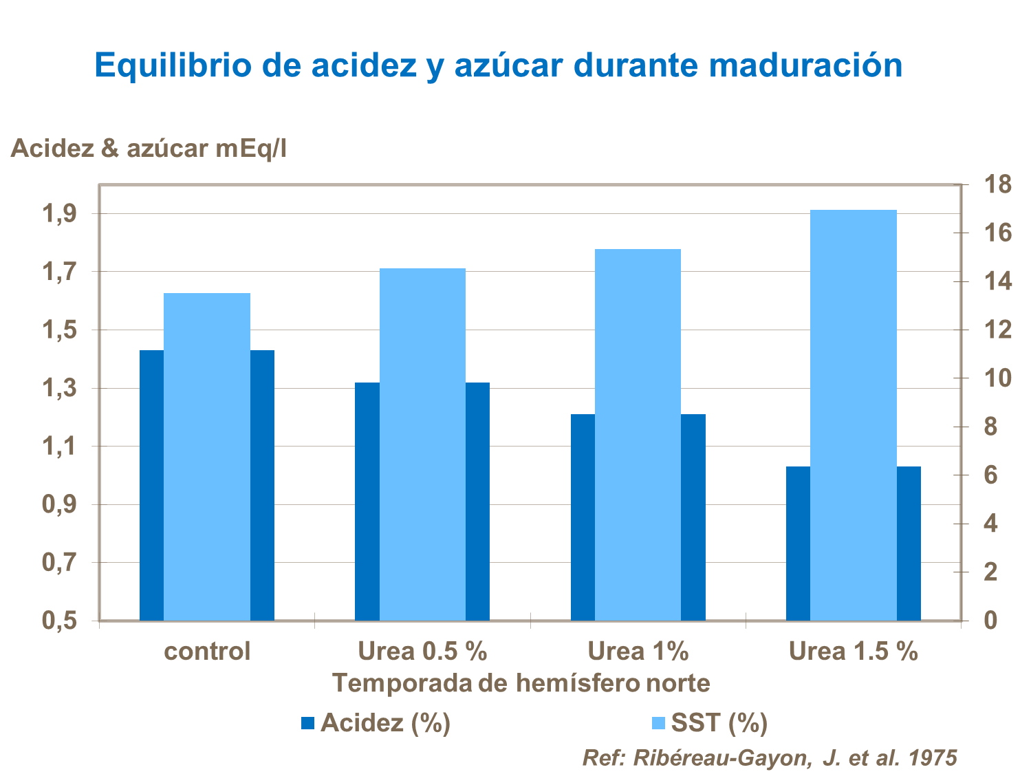 Una buena relación °Brix/ácido es de 25:1 o más, pero algunas variedades son comercializables con una relación °Brix/ácido de 20:1. La relación °Brix/ácido de 20:1 se acepta como el estándar para la mayoría de variedades en Europa.