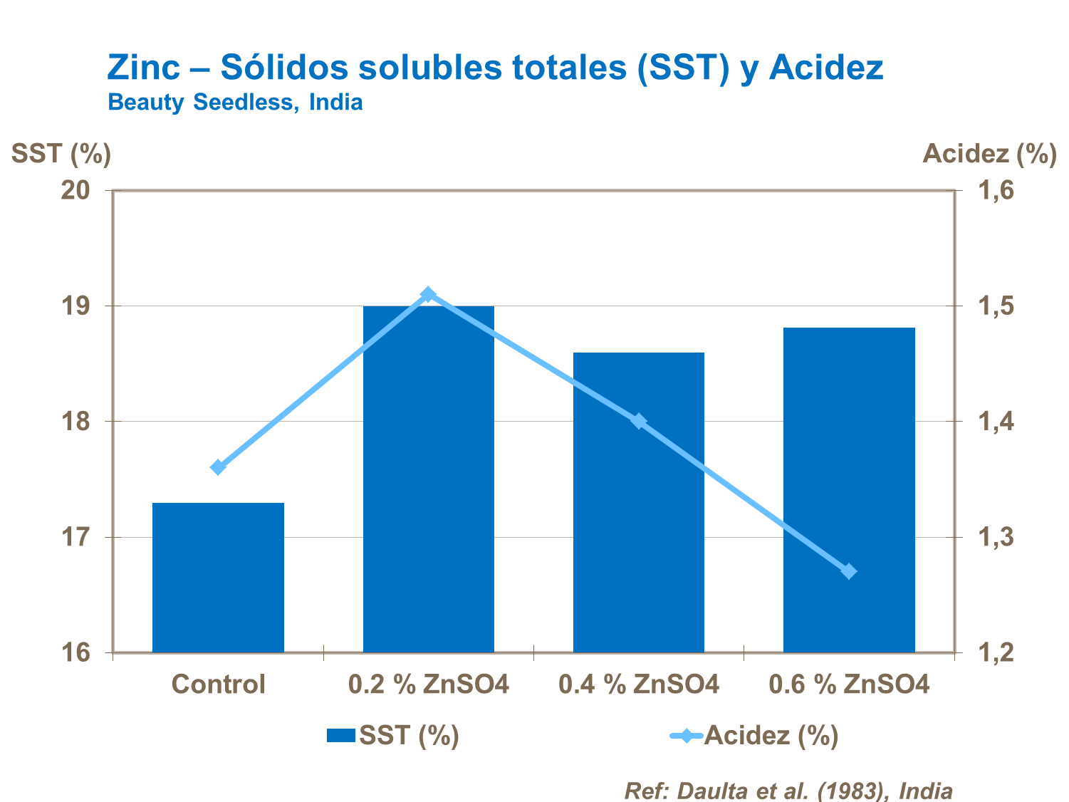 El Zinc está involucrado en el proceso de desarrollo de cloroplastos, siendo así esencial para mejorar la calidad. Las aplicaciones foliares de zinc dieron como resultado un aumento en el contenido de azúcares en la uva.
