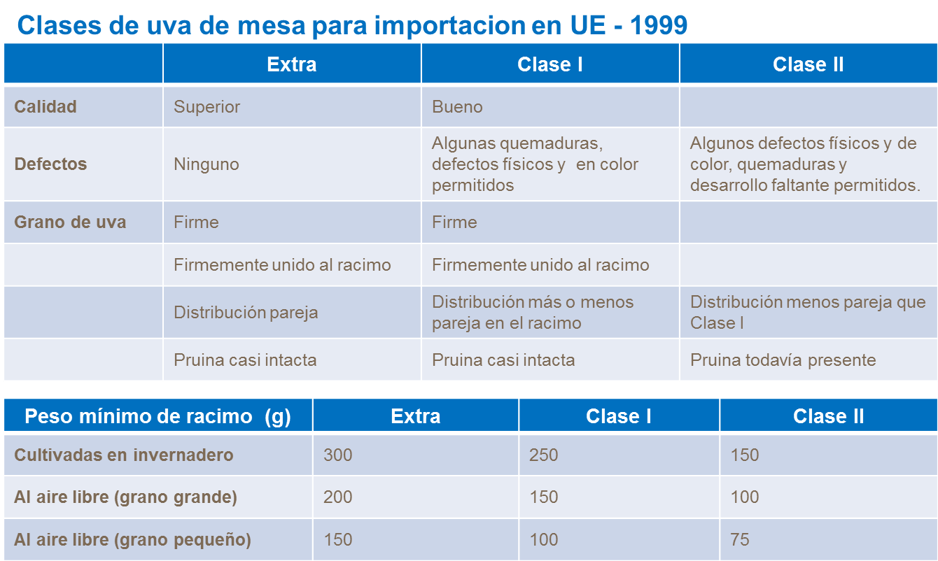 La uva se clasifica según una serie de parámetros de calidad. Existen incluso requerimientos mínimos de empaquetado y etiquetado que se deben cumplir para obtener la clasificación deseada.